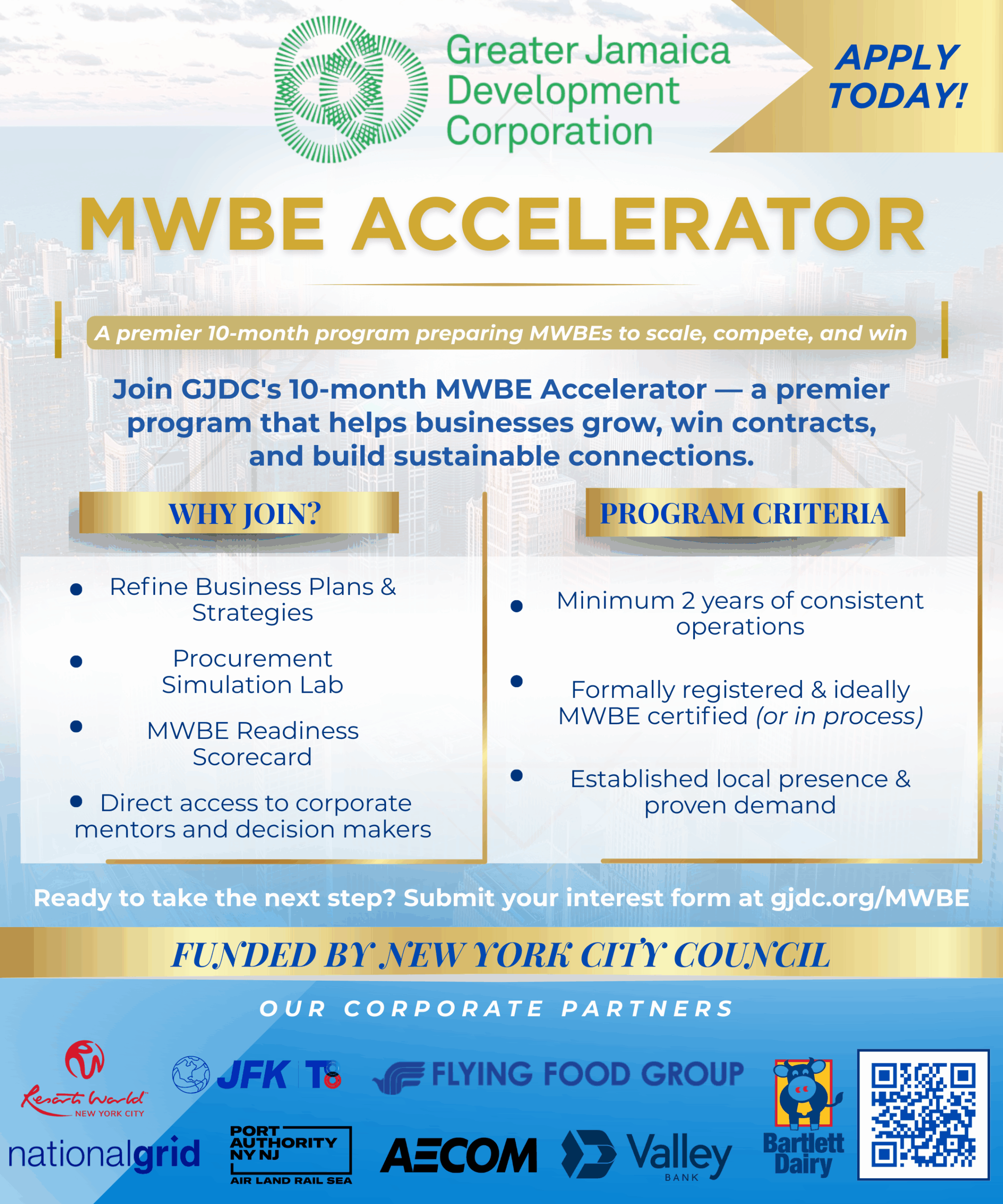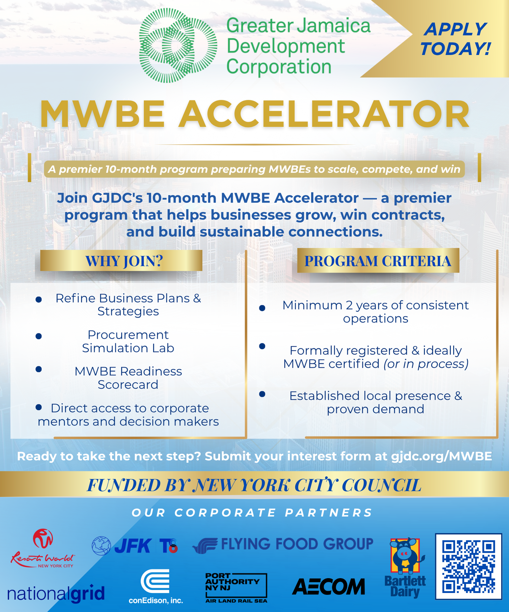 Greater Jamaica Development Corporation proudly announces the launch of our MWBE Accelerator — a personalized business advancement experience fully funded by the New York City Council. This exclusive initiative is designed to help established Minority- or Women-Owned Business Enterprises across New York City compete, thrive, and create sustainable success.
